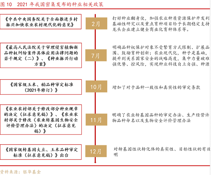 进入2020年,国家频频提及转基因商业化,例如2020年12月,农业农村部发布《2020年种业市场监管工作方案》,提出规范生产基地,推进许可备案信息化,严查非法转基因种子,严格监督种子质量,加强植物新品种权保护,开展种禽畜和桑蚕种质量检查。2021年中央一号文件继续强调粮食安全时,提出要打好种业翻身仗。农业现代化,种子是基础。提出要加强农业种质资源保护开发利用,对育种基础性研究以及重点育种项目给予长期稳定支持,加快实施农业生物育种重大科技项目,支持种业龙头企业建立健全商业化育种体系等,2021年以来,种业相关政策密集发布。