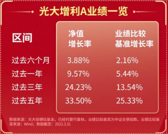在晨星中国最近公开的数据中,截至2022年3月31日,由明星基金经理黄波管的光大增利A近一年、三年、五年业绩均排名同期普通债券型基金前十,分别为第7/191、第2/143、第6/112,这也是同期唯一一只上述时间维度均排名前十的普通债券型基金。