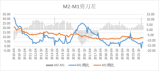 通常来说,剪刀差收窄时经济活跃度高,原因在于当企业对经济前景乐观时,补库或资本开支的需求使企业将其他存款或理财转移为活期存款,能有效带动 M1上升。从最近的数据来看,2021年之后,剪刀差逐步扩大,代表着经济活力开始持续下滑。