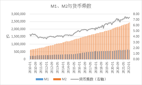 从上图可以看到,截至2022年2月,M2达244万亿,M1为62万亿。2018 年以来,M2的增长速度显著高于M1。这与央行通过多次降低存款准备金率,将法定存款准备金转换为超额准备金,扩大了货币乘数有关。