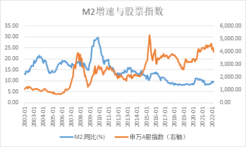 M2的同比增长反映了整个社会货币供应量的变化,从货币供应到经济拉动还存在着传导关系,因此,相对于M1指标,M2指标与股债等大类资产的走势相关性会略弱,需要对此进行进一步分析。