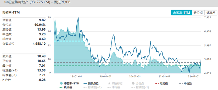 当前全指房地产市盈率-TTM为9.82,处于历史60.94%分位水平;市净率为1.07,处于历史15.63%分位水平;全指房地产市盈率处于中等水平,市净率处于相对偏低水平。