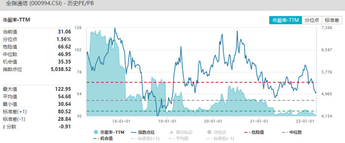 当前全指通信市盈率-TTM为31.06,处于历史1.56%分位水平;市净率为1.81,处于历史0.39%分位水平;全指信息整体估值水平相对偏低。