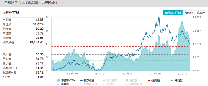 当前全指消费市盈率-TTM为44.33,处于历史91.02%分位水平;市净率为5.78,处于历史60.55%分位水平;全指消费市盈率相对偏高,市净率处于中等偏高位置。