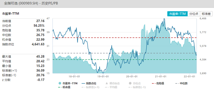 当前全指可选市盈率-TTM为27.16,处于历史56.25%分位水平;市净率为2.47,处于历史45.70%分位水平;全指可选整体估值水平处于中等水平。