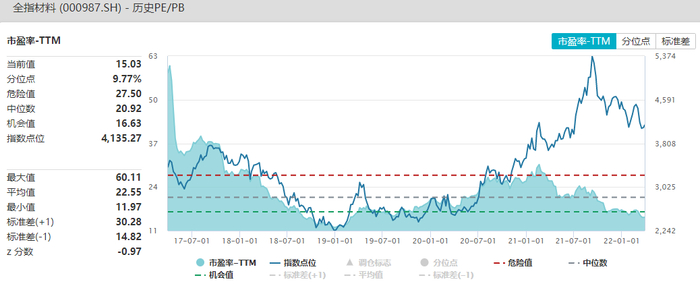 当前全指材料市盈率-TTM为15.03,处于历史9.77%分位水平;市净率为2.26,处于历史55.47%分位水平;全指材料市盈率相对偏低,市净率并不算低估。
