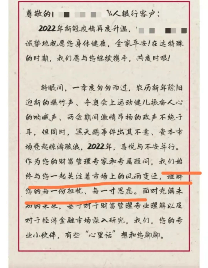 但,就在我之前看大型机构,特别是私人银行给客户发的信时,我发现,基调和笔触大概都是这样的,“我们始终与您一起关注着市场上的风雨变迁,理解您的每一份担忧,每一寸思虑......”