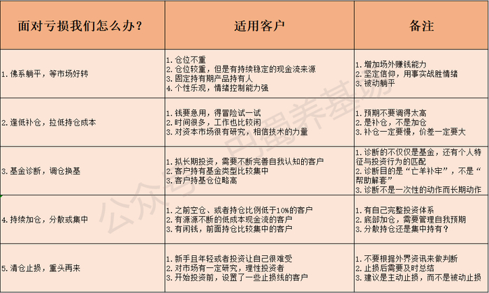 而高配的客户呢?即前期基于各种原因,已经买的比较多的客户此刻该怎么办呢?该类客户的方案建议其实是“部分赎回”。此刻我们最应该和客户一起做的是“审视问题,修正错误”。即在前期不该配置那么多的情况下, 我已经配置的太多,犯了第一个错误,此刻我们就不能再继续犯第二个错误了,而是应该痛定思痛,进行部分的减仓,回归到自己合理的仓位。