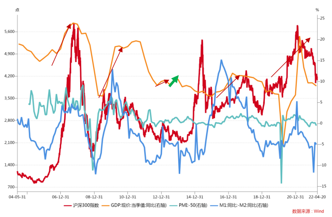 事实上,如果把目光聚焦到当时环境下,可以看到经济周期和沪深300指数的走势还是基本吻合的。