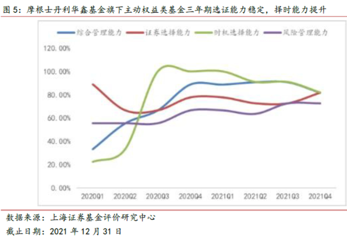 选证能力稳定,择时能力优异。上海证券基金产品评价结果显示,截至2021年四季度末,摩根士丹利华鑫基金管理的主动权益基金产品的三年期选证、择时及风控能力指标处于3星及以上的概率均高于70%。从趋势上看,公司主动权益类基金三年期选证能力处于3星及以上的概率保持稳定;择时能力与风险管理能力处于3星及以上的概率提升明显。