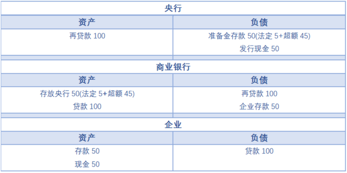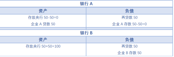 假设现在有银行A和银行B,央行以再贷款的形式,分别向两家银行投放了50元基础货币,如下表: