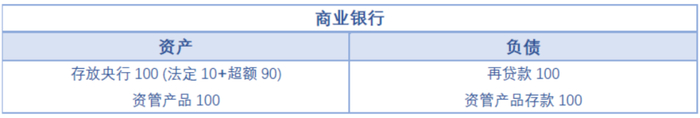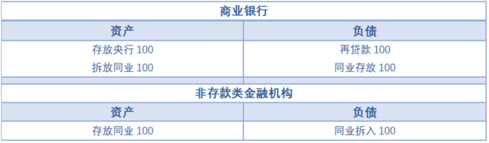对银行来说,假设通过同业拆借向非存款类金融机构融出资金100元,非存款类金融机构又将资金存放在其银行账户中,则商业银行和非存款类金融机构资产负债简表为:
