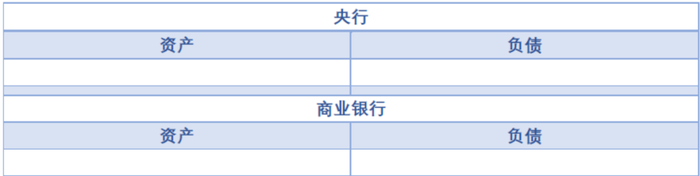 在详细分析货币派生的各类途径与细节之前,我们需要先理解二级银行体系。下面以一个简化的模型加以解释。假设一国建立二级银行体系初始只有央行和一家商业银行,它们最初的资产负债表为两张空白表,如下表所示: