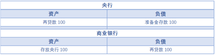 那么,以央行投放100元再贷款为例,央行、银行的资产负债表变为: