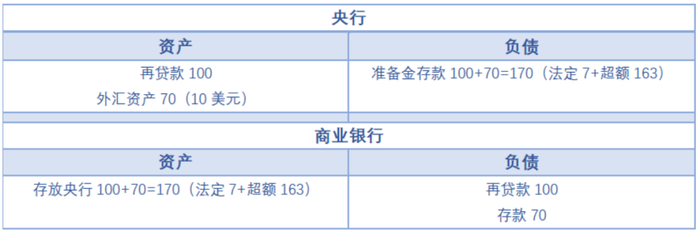 当居民部门因为贸易或获得外商投资等途径从境外获取了外汇后,会向银行兑换成为可流通的人民币。比如某企业因为商品出口获得了10美元,按照美元兑人民币1比7的比例向银行兑换成人民币,又将其存回银行账户,则银行最初的资产负债简表变为: