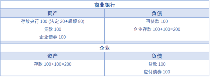 在表3的基础上,假设商业银行又在一级市场认购了企业发行的100元面额债券,而企业拿到了发行资金后,又存回了银行账户里,此时资产负债表变为: