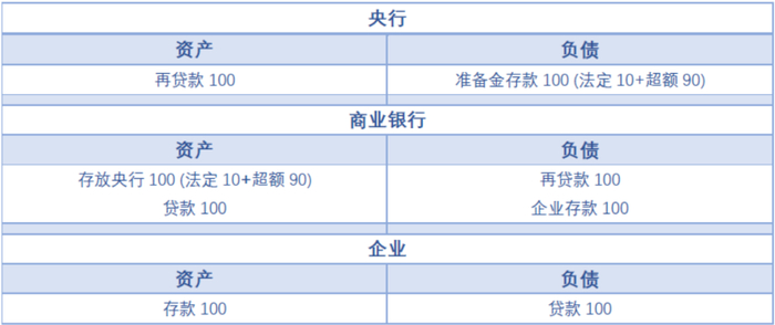 假设商业银行发行了一笔100元的贷款,类似上文央行给银行投放基础货币,银行给企业发放贷款后,企业又存回它开在银行的账户中,形成100元存款。这时法定存款准备金制度便开始产生作用了,在有法定存款准备金约束的条件下,商业银行需将居民部门存款的一定比例作为法定存款准备金,不得动用。此时,央行、银行与企业三方的资产负债表变为: