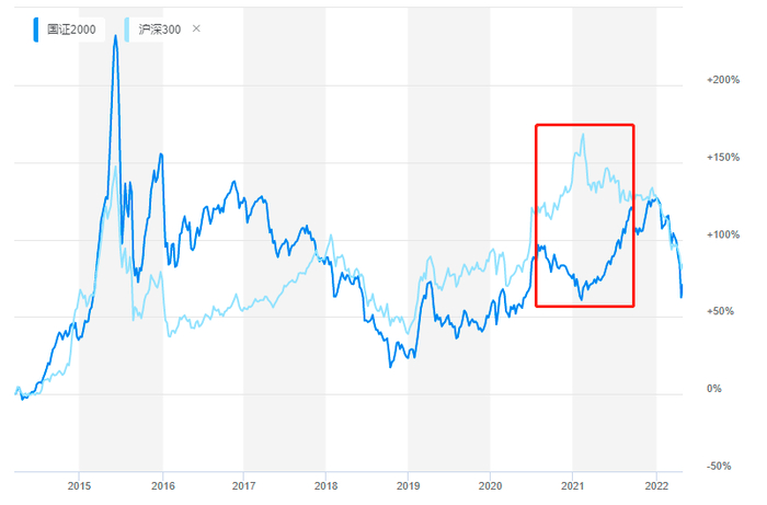 在市场风格出现分化时,国证2000与沪深300的互补性较强,甚至出现明显的反向波动。这是因为在不同阶段的市场环境下,市场对大盘股与小盘股的估值存在预期差,导致走势高度分化,特别是2021年2月份沪深300见顶后出现长时间回调行情,而这一期间的国证2000则开启了一波明显的上涨趋势行情。如下图所示,历史走势显示两者之间有较好的互补性。