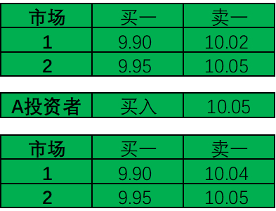 一般来说A投资者订单(买入 C 价格10.05元),市场1报价为(买一9.90 卖一10.02),市场2报价为(买一9.95 卖一10.05)高频交易商迅速将市场1中的卖一打掉,然后挂出卖价10.04,等待A投资者订单进入市场和高频交易商的卖出订单成交。