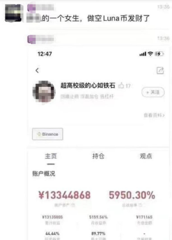 有人欢喜有人忧,在这场暴跌中,也有投资者“实现财富自由”。近日,一张在币圈流传的截图则显示,一位用户名为“超高校级的心如铁石”的币安用户收益为5950%,收益截图显示,她的总收益为1313.5万元,按5950%的收益率算,她的本金只有22万元!
