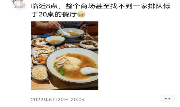 5.20那天晚上,我刚好去接女儿放学。晚上8:30,原本开车20分钟的路程足足开了快1小时,为什么?因为那一天很多餐馆、酒吧、酒店的生意很好。我还刷到一个朋友圈,晚上8:00,没有一家餐厅的排队少于20桌。
