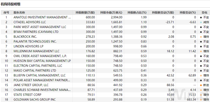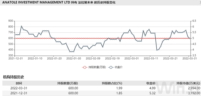 据WIND数据:今年一季度末,晨曦投资持有600万股的法拉第未来,折合2994万美元市值,领先于城堡基金、贝莱德、千禧年、简街资本等大牌机构。