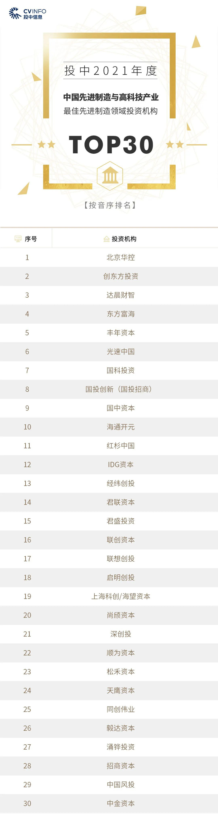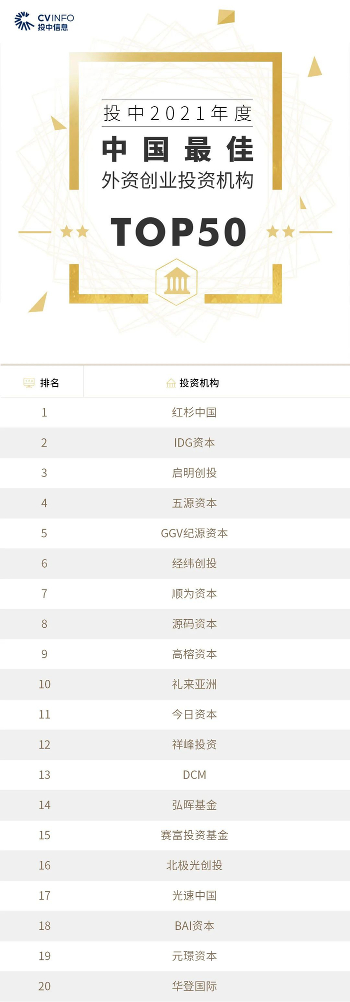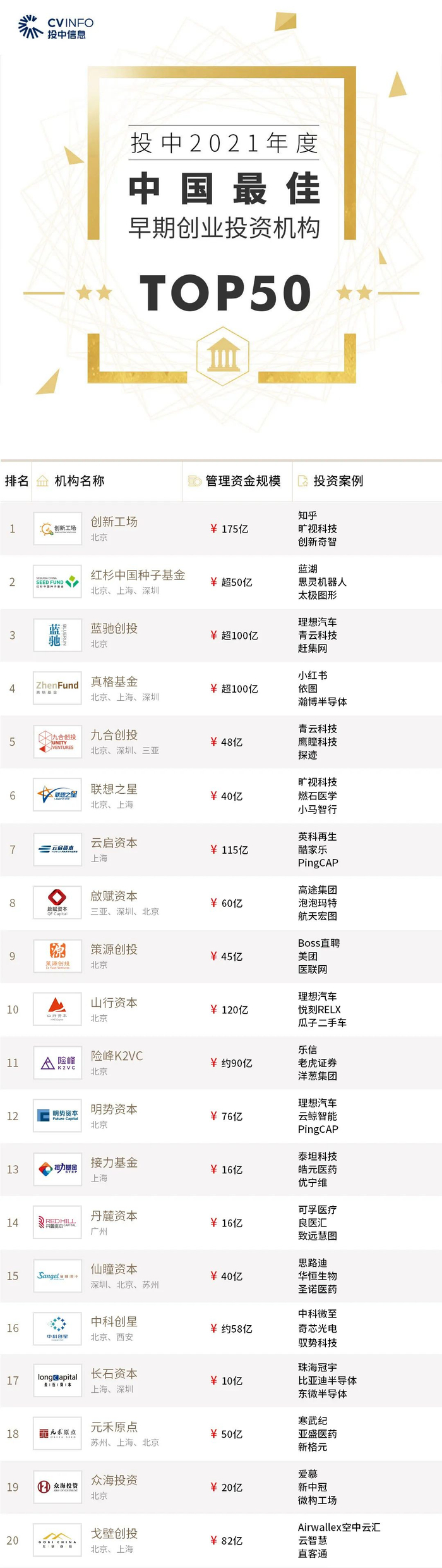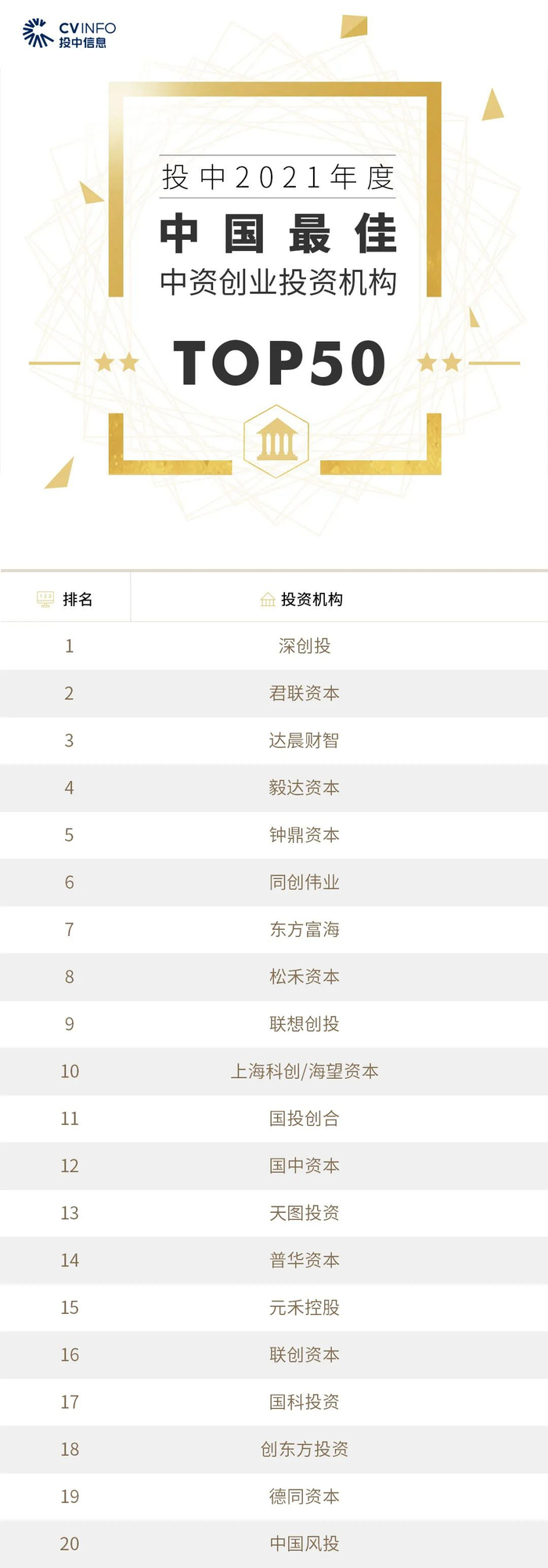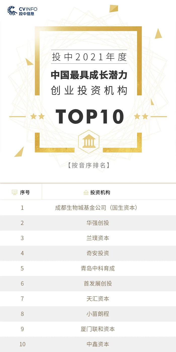 “投中2021年度中国最佳创业投资机构TOP100”榜单前十名分别是,红杉中国、深创投、IDG资本、启明创投、五源资本、君联资本、GGV纪源资本、达晨财智、经纬创投和毅达资本。
