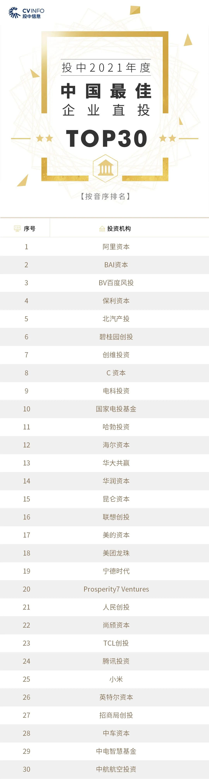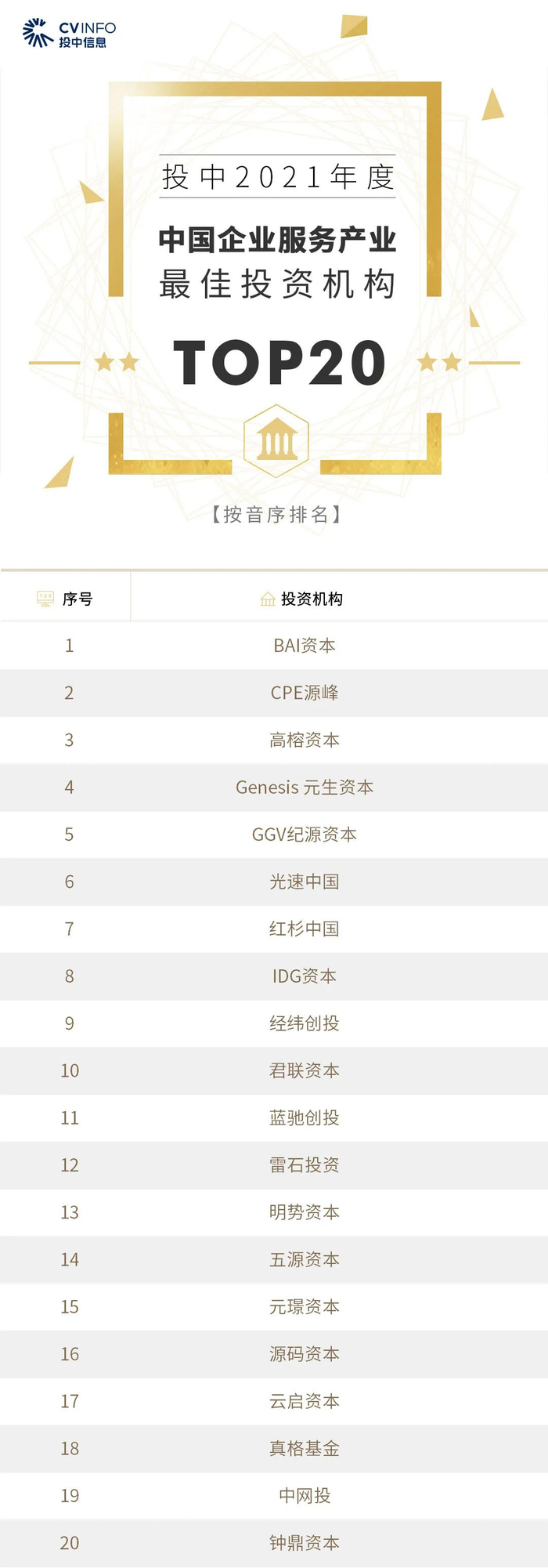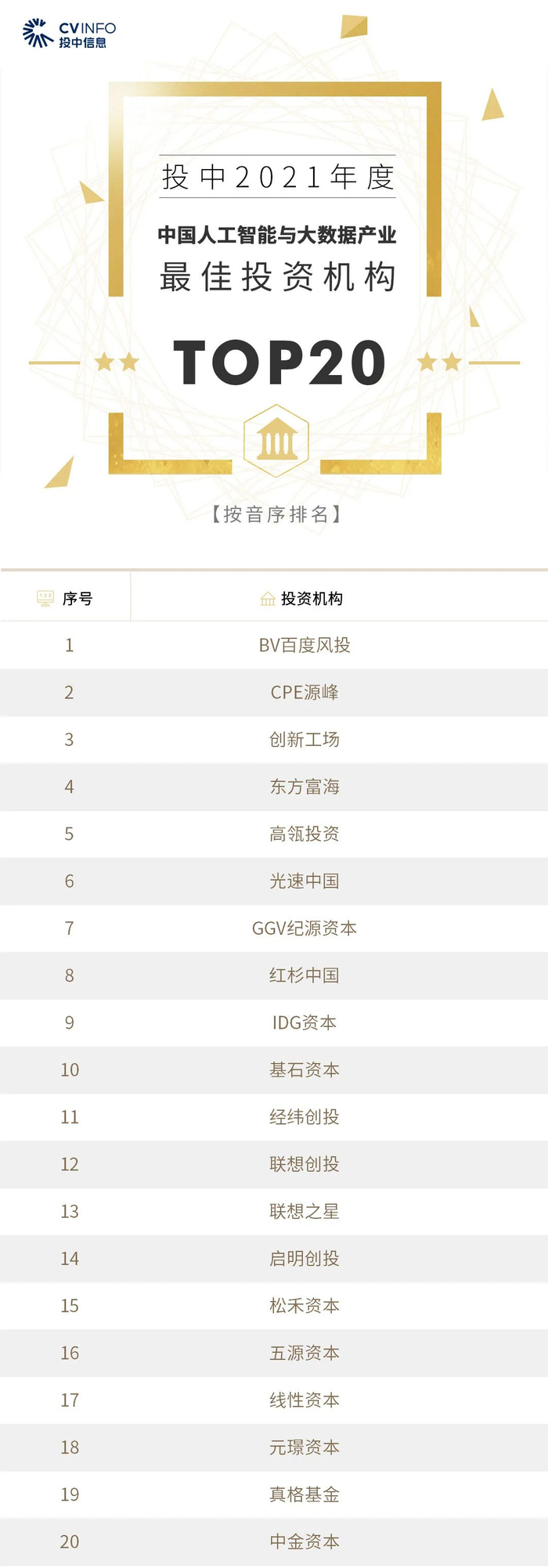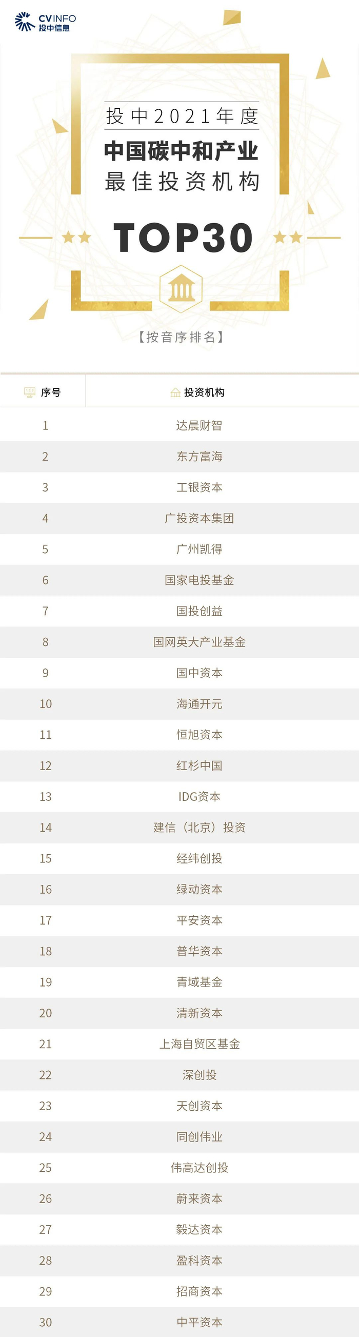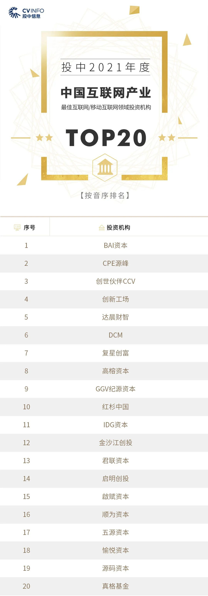 “投中2021年度中国最佳创业投资机构TOP100”榜单前十名分别是,红杉中国、深创投、IDG资本、启明创投、五源资本、君联资本、GGV纪源资本、达晨财智、经纬创投和毅达资本。
