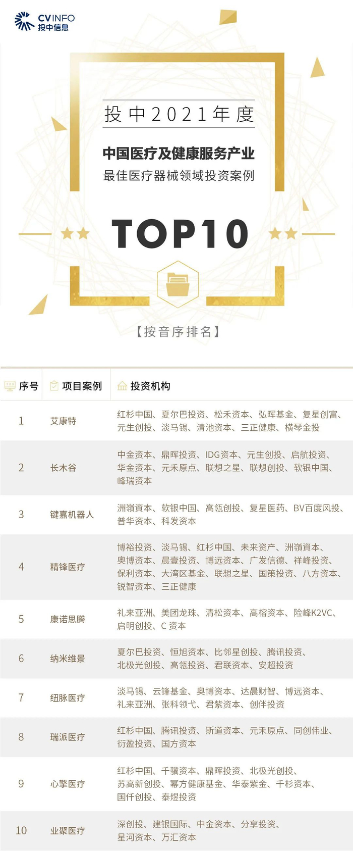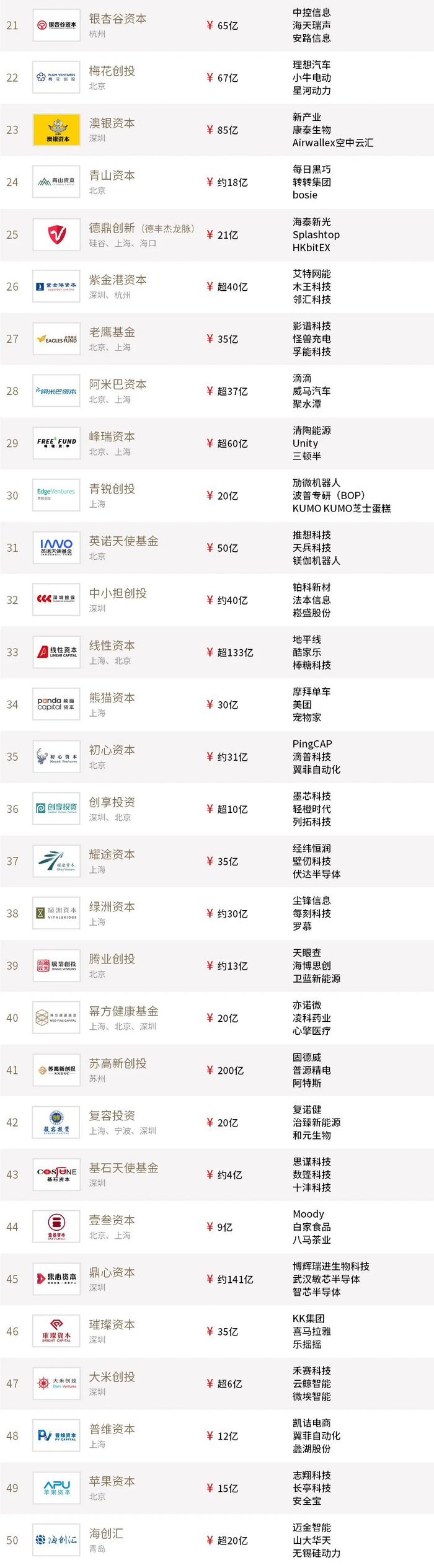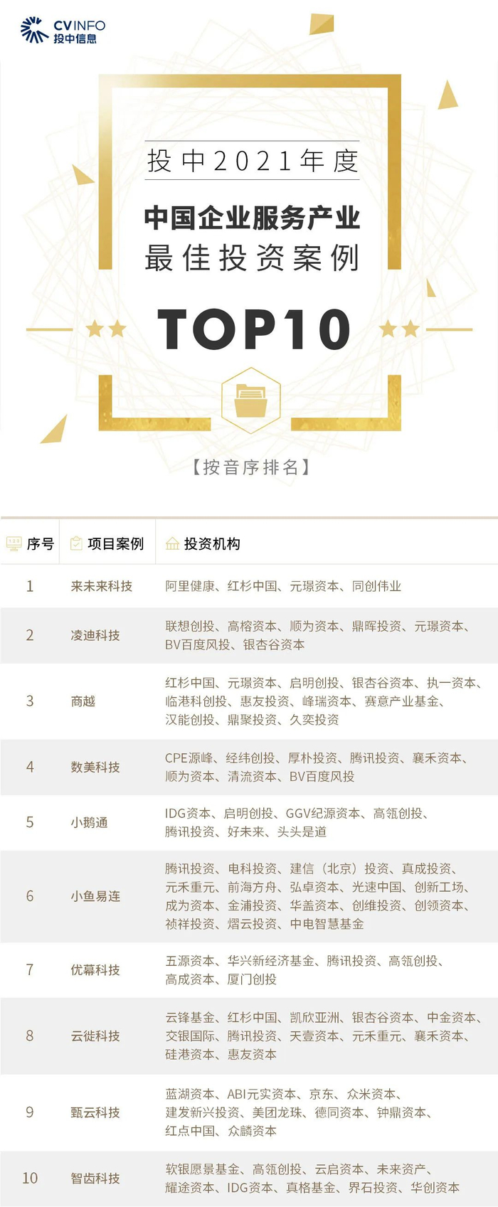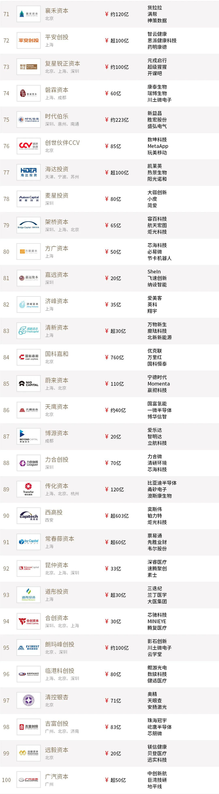 “投中2021年度中国最佳创业投资机构TOP100”榜单前十名分别是,红杉中国、深创投、IDG资本、启明创投、五源资本、君联资本、GGV纪源资本、达晨财智、经纬创投和毅达资本。