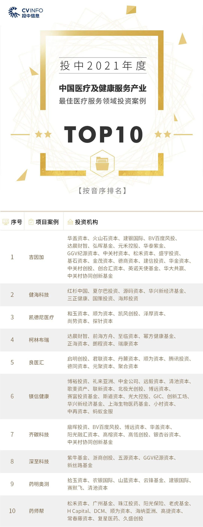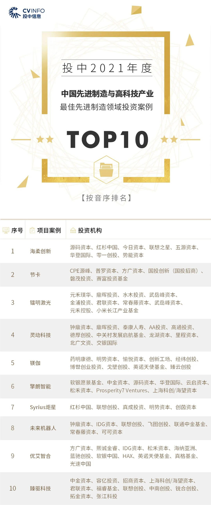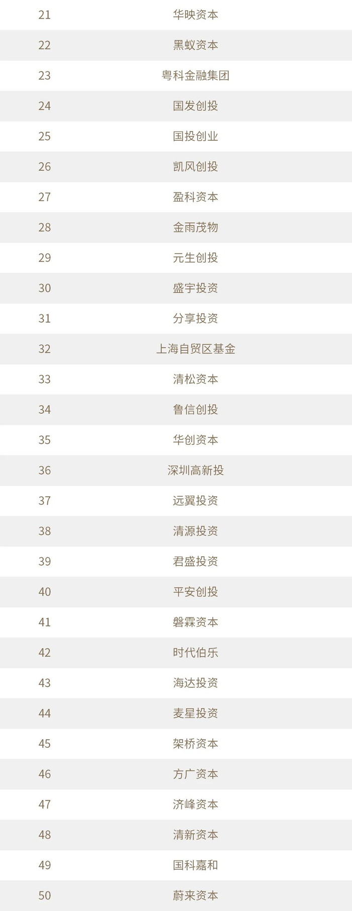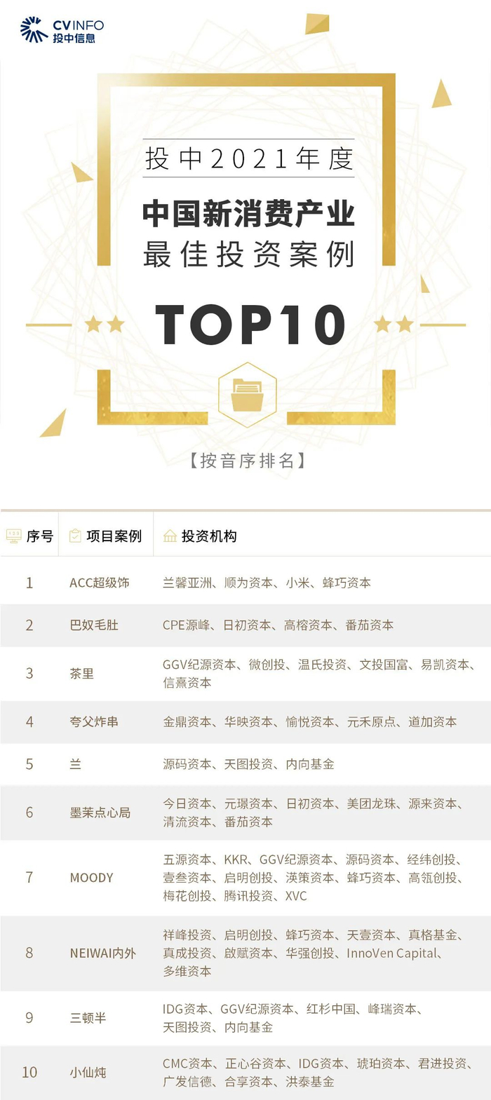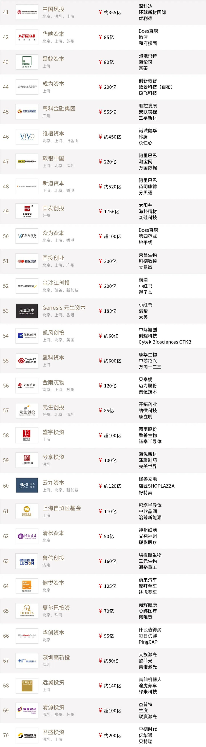 “投中2021年度中国最佳创业投资机构TOP100”榜单前十名分别是,红杉中国、深创投、IDG资本、启明创投、五源资本、君联资本、GGV纪源资本、达晨财智、经纬创投和毅达资本。