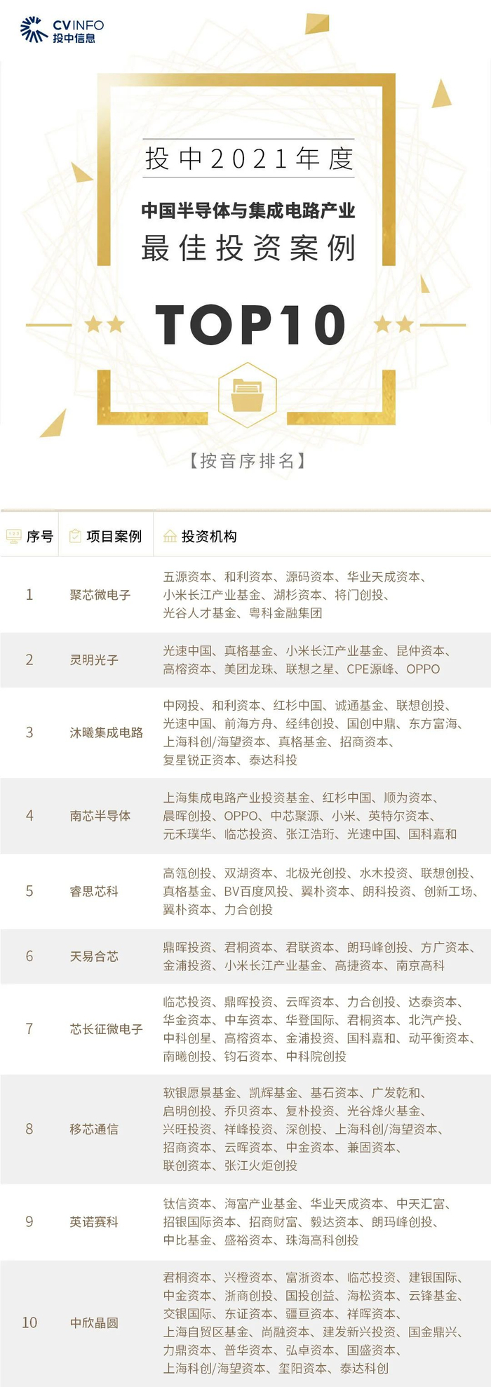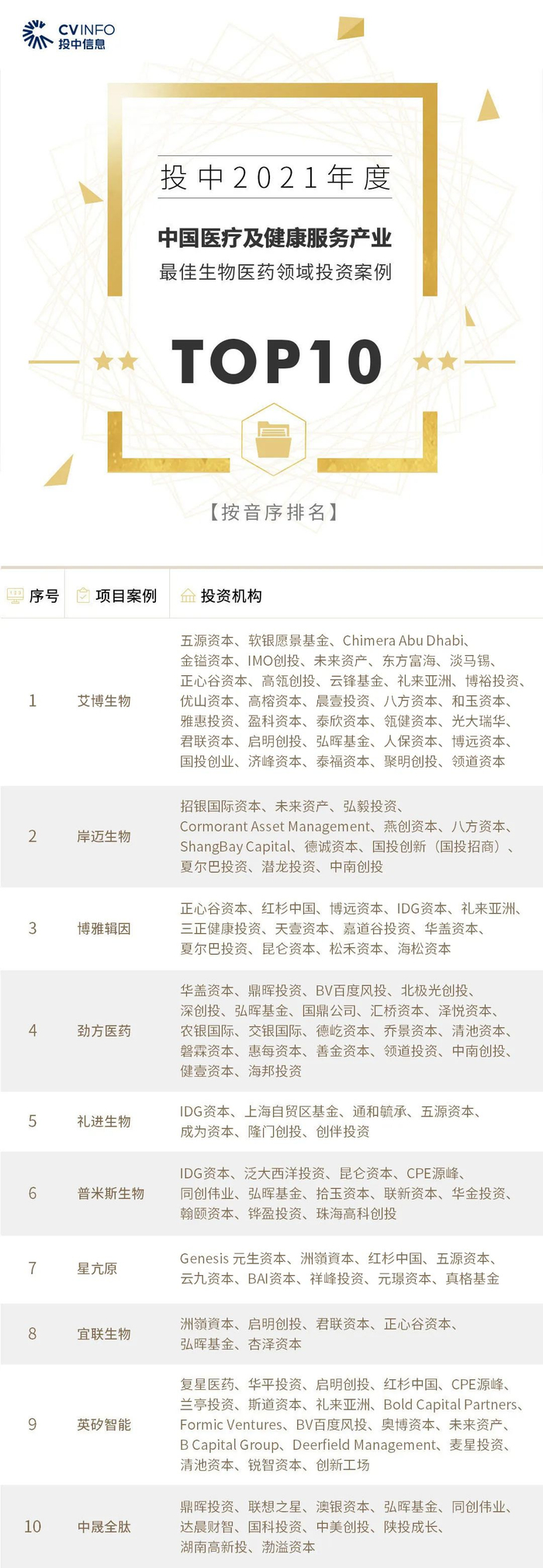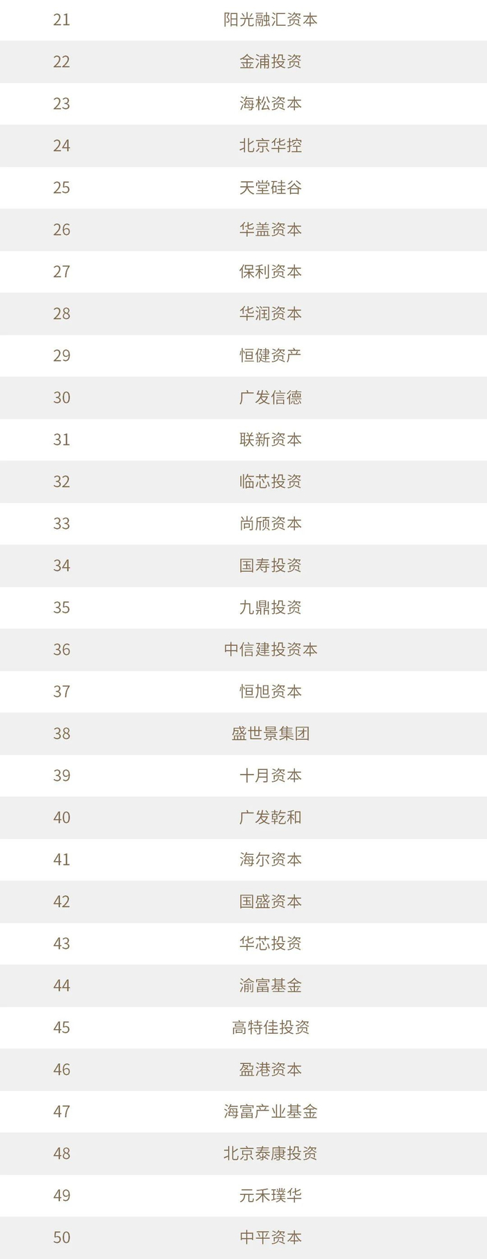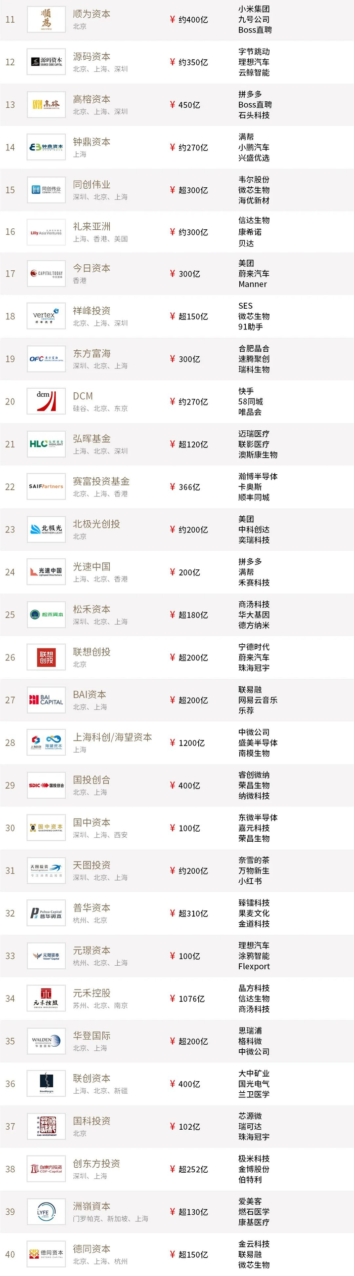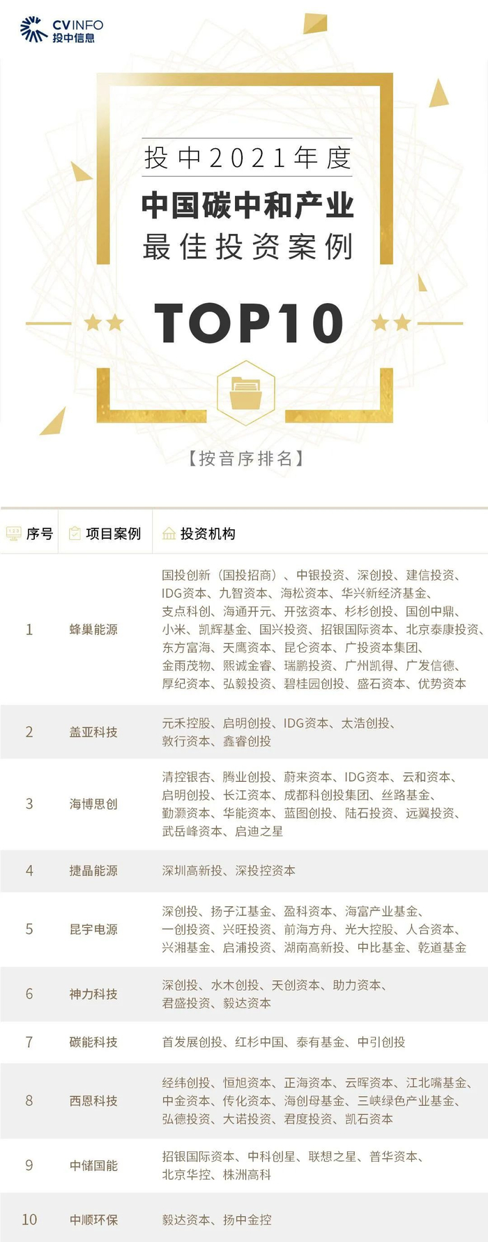 “投中2021年度中国最佳创业投资机构TOP100”榜单前十名分别是,红杉中国、深创投、IDG资本、启明创投、五源资本、君联资本、GGV纪源资本、达晨财智、经纬创投和毅达资本。