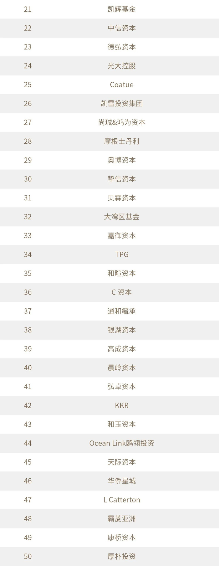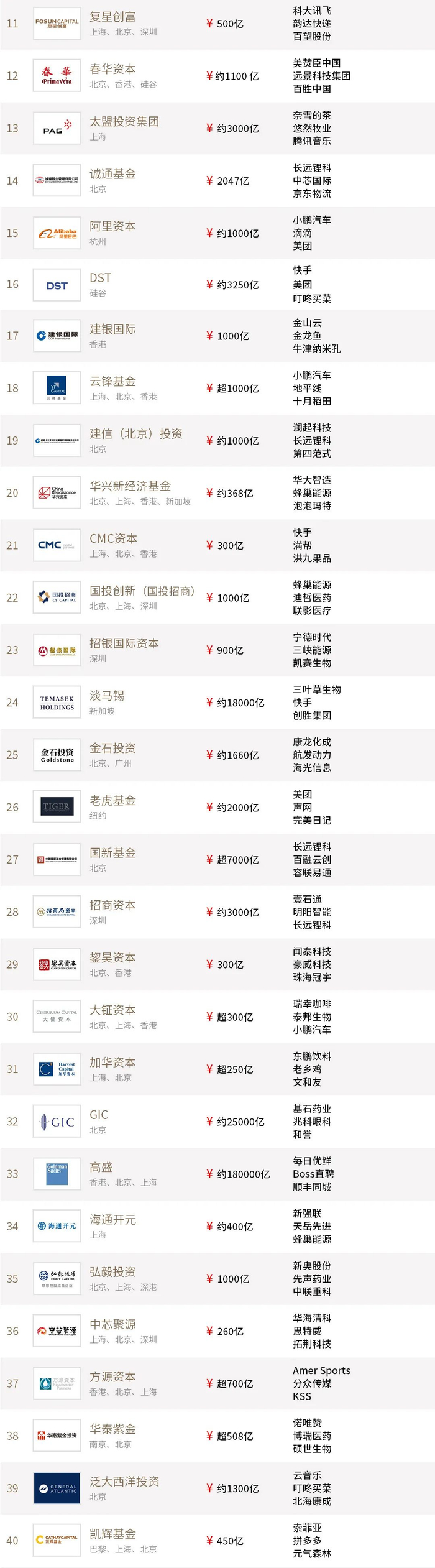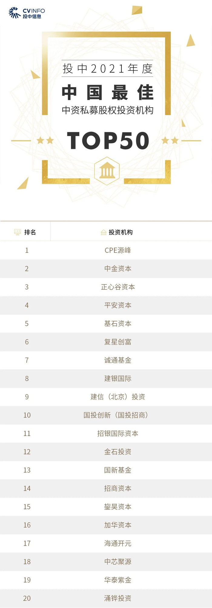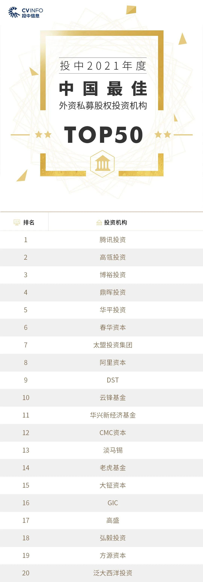 “投中2021年度中国最佳私募股权投资机构TOP100”榜单前十名分别是,腾讯投资、高瓴投资、CPE源峰、中金资本、博裕投资、正心谷资本、鼎晖投资、平安资本、基石资本、华平投资。