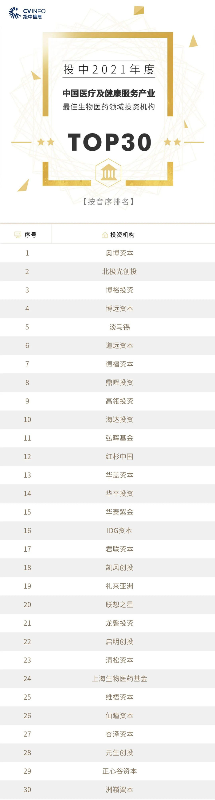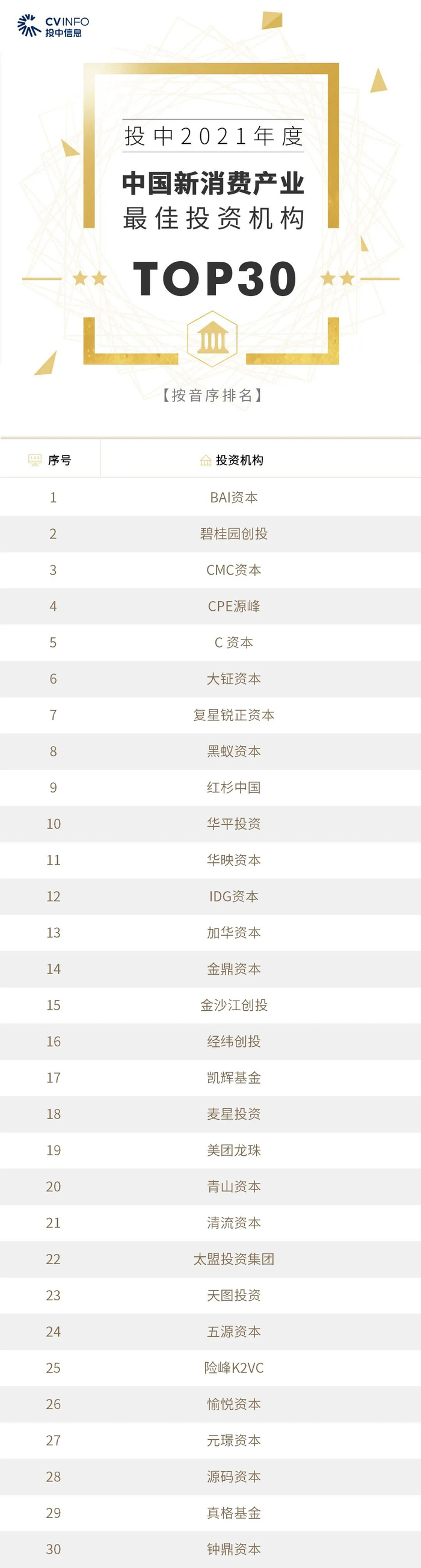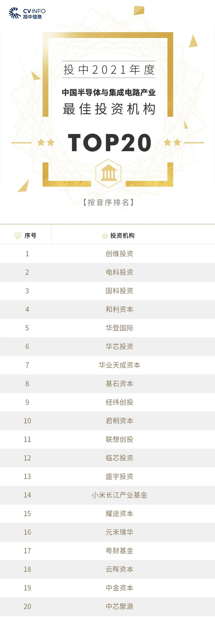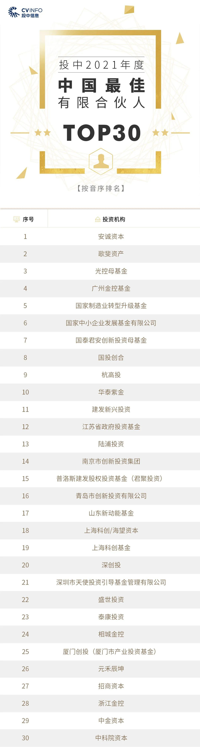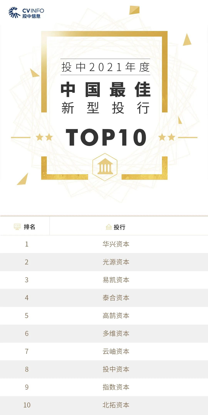 投中信息连续16年作为独立的第三方机构发布中国创业投资机构暨私募股权投资系列榜单——“投中榜”。依托CVSource投中数据,通过对投资机构广泛调研,覆盖超千家私募股权领域活跃投资机构。该榜单以严格的标准进行榜单划分,以专业、权威和严谨著称,因此又被称为国内股权投资行业的风向标,目前是诸多大型机构LP的重要出资依据。