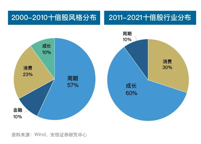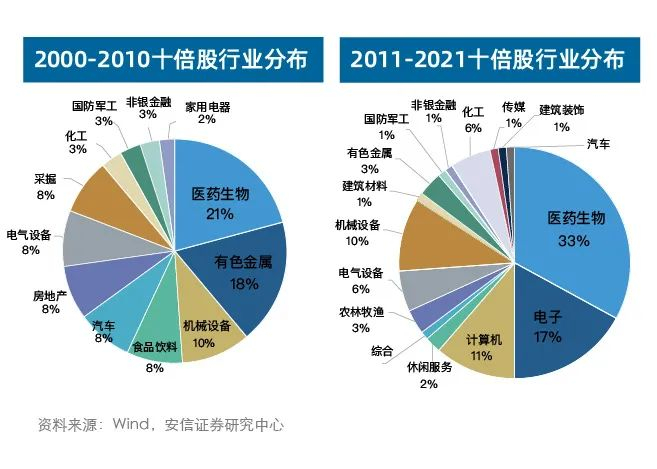 据安信证券统计显示,就过往的十倍股行业分布来看,2000年至2010年的十倍股中,医药生物有色金属、机械设备、采掘、房地产行业的占比均超过5%;而在2011年至2021年的十倍股中,医药生物、电子、食品饮料、计算机的占比均较高。
