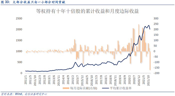 研究表明,如果在2011年初以等权重持有2011-2021年间所有十倍股至2021年底,区间内大部分的时间对于累计收益的贡献是非常小的,而累计收益的快速增长仅依靠相当短的一段时间(比如2019年和2020年),这既体现了复利的力量,也说明了长期主义的重要性。