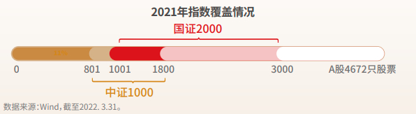 随着注册制的全面推进,A股市场不断扩容,截至2021年底沪深两市个股已超过4200家。市场的快速扩容使得原有宽基指数所描述的规模类型出现变化,比如原来代表小盘股的中证1000指数,成分股为市值排名801—1800的证券,对小盘股的覆盖局限已显。