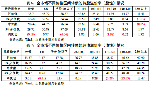 转债方面:上周中证转债指数整体上涨1%,转债整体估值有所下行,转债转股溢价率整体下行0.59%,纯债溢价率上行3.01%,分类别看,各平价转债的转股溢价率涨跌互现。