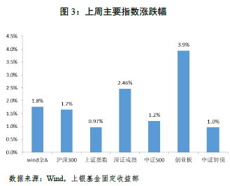 股票方面:上周股指整体上涨,上证指数上涨0.97%,深证成指上涨2.46%,创业板指上涨3.9%;行业板块方面,电力设备、家电和汽车等行业表现较好,上涨4%-5%,煤炭、钢铁以及石化等行业表现较弱,下跌3%-5%。