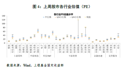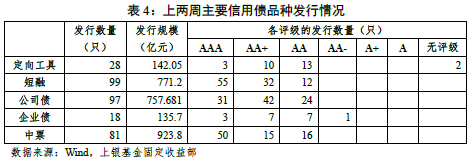 (3)期限利差方面,上周长、短端品种收益率变化不大,国债10-1Y利差走阔2BP至77BP,国开10-1Y利差收窄1BP至93BP。