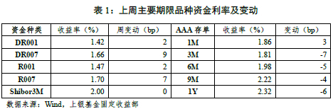 上周地方债发行继续放量,央行在公开市场操作也并未加量,但银行间充裕的流动性支持资金利率继续维持低位。具体来看上周资金市场情况,(1)上周央行公开市场有500亿元逆回购和2000亿MLF到期,当周累计进行了500亿元逆回购操作和2000亿MLF投放,实现完全对冲;(2)资金价格方面,截至上周五收盘,DR001和R001收益率均上行2BP,分别收于1.42%和1.47%;DR007和R007收益率分别上行9BP和7BP,分别收于1.66%和1.70%;Shibor3M收益率持平于2.00%。