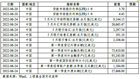 (6)美联储公布最新利率决议,将基准利率上调75个基点至1.50%-1.75%区间,为1994年来最大幅度的加息。美联储声明表示,高度关注通胀风险,“坚决承诺”将通胀率恢复到2%,并重申认为持续加息是适当的。FOMC委员们以10-1的投票结果通过此次的利率决定。投反对票者是美联储乔治。FOMC最新经济预期上调了通胀预期,下调经济增长预期。其2022、2023、2024年底PCE通胀预期中值分别为5.2%、2.6%、2.2%(3月预期分别为4.3%、2.7%、2.3%)。2022、2023、2024年底GDP增速预期中值分别为1.7%、1.7%、1.9%(3月预期分别为2.8%、2.2%、2%)。美联储预计在2024年开始降息。