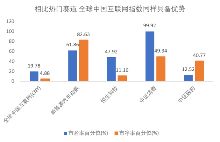 横向对比看,不论是相比沪深300、创业板指、恒生指数等宽基,还是相比新能源车、医药、消费、恒生科技等热门赛道,全球中国互联网的市盈率和市净率百分位偏低,更具性价比。