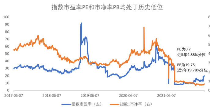 目前,中证全球中国互联网市盈率为19.75倍,处于近5年19.78%的百分位;市净率为0.7,处于近5年4.88%的百分位。纵向对比看,指数估值已经到了较低的位置。