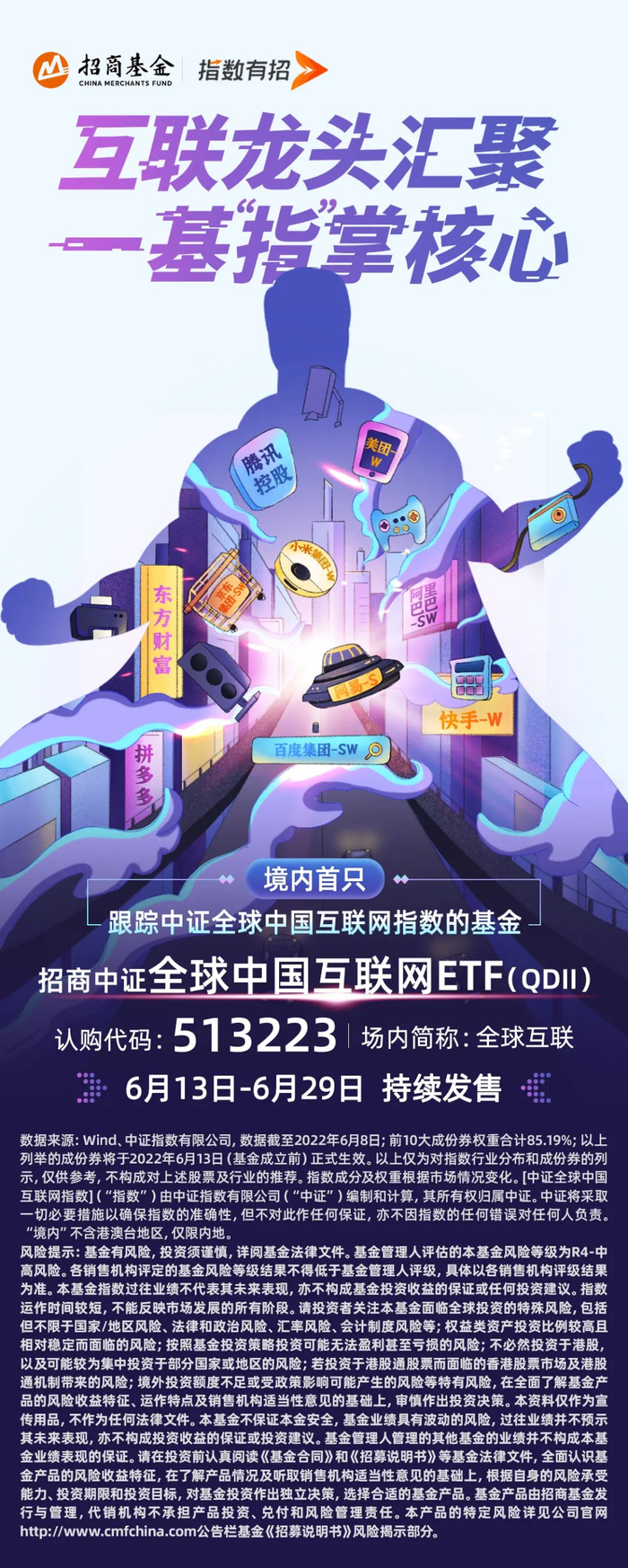 为帮助投资者更好把握板块反弹机遇,招商中证全球中国互联网ETF(认购代码:513223,场内简称:全球互联)发售。该基金密切跟踪“中证全球中国互联网指数”,指数主要由全球上市的最大30家中国互联网公司构成,龙头汇聚,代表性强,是投资者一键布局互联网巨头的好工具。该基金也是境内注2首只跟踪中证全球中国互联网指数的基金。