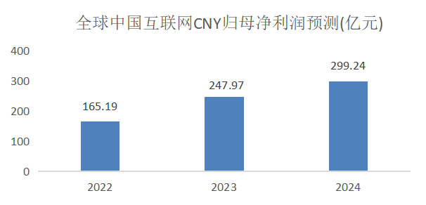 从未来的盈利增长看,WIND数据显示,市场对全球中国互联网未来三年的盈利能力预期较为乐观,归母净利润逐年增加,至2024年净利润达到299亿元。