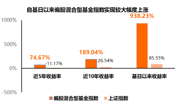 取上证指数与偏股混合型基金指数进行对比发现,近5年、近10年以及自基日(2003年底)以来,上证指数表现平平,涨幅分别为-11.17%、26.54%、85.55%,而偏股混合型基金指数收益率分别高达74.67%、189.04%和938.23%,表现突出。