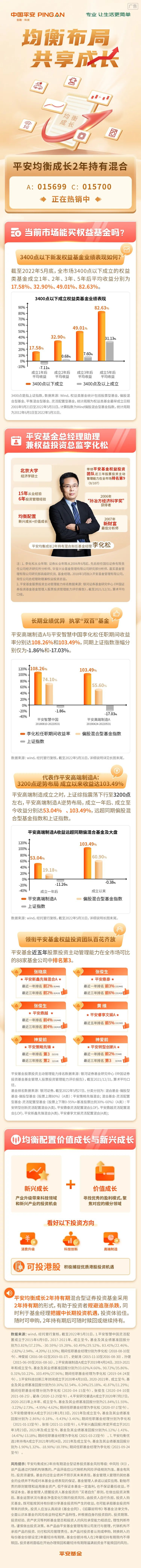 业绩数据来源:wind,经托管行复核,截至2022年5月31日。1.平安智慧中国灵活配置成立于2015年6月9日,2017-2021年,成立至今,基金及其业绩基准回报分别为3.81%/17.23%、-30.59%/-19.28%、60.49%/29.52%、83.41%/22.46%、-2.82%/-2.94%、-4.20%/-11.93%;期间任职基金经理分别为李化松(2018-08-10至今)、神爱前(2016-08-02至2019-01-17)、史献涛(2015-11-10至2016-08-30)、孙健(2015-06-09至2016-08-16)。2.平安高端制造A成立于2019年4月24日,2019-2021年和成立至今,基金及其业绩基准回报分别为33.02%/4.66%、90.72%/35.86%、0.31%/10.22%、103.49%/27.96%;期间任职基金经理为李化松(2019-04-24至今)。3.平安科技创新三年封闭成立于2020年4月10日,2020-2021年、成立至今,基金及其业绩基准回报分别为59.16%/32.54%、0.24%/25.18%、41.87%/11.29%;期间任职基金经理分别为李化松(2020-04-15至今)、张俊生(2020-04-10至2021-08-25)、翟森(2020-12-29至今) 。4.平安研究睿选A成立于2020年7月17日,2020-2021年上半年、成立至今,基金及其业绩基准回报分别为21.84%/11.55%、-3.22%/-2.73%、-4.95%/-4.62%;期间任职基金经理为李化松(2020-07-17至今)。5.平安稳健增长A成立于2021年1月13日,2021年及成立至今,基金及其业绩基准回报分别为-2.86%/-0.18%、-9.43%/-3.46%;期间任职基金经理分别为李化松(2021-01-13至今)、张恒(2021-11-10至今)。6.平安兴鑫回报1年定开成立于2021年3月23日,2021年及成立至今,基金及其业绩基准回报分别为6.12%/-1.41%、-14.47%/-13.18%;期间任职基金经理为李化松(2021-03-23至今) 。7、平安均衡优选1年持有A成立于2021年9月24日,2021年及成立至今,基金及其业绩基准回报分别为-1.90%/1.32%、-18.90%/-10.78%;期间任职基金经理为李化松(2021-09-24至今) 。