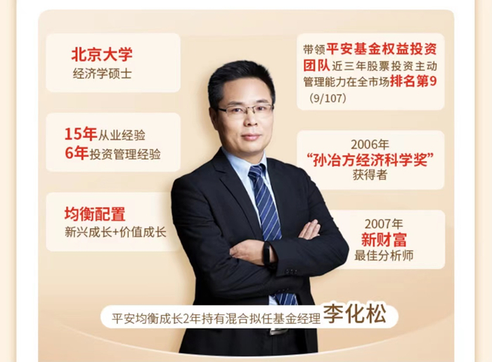 平安均衡成长2年持有混合由平安基金总经理助理兼权益投资总监李化松挂帅。李化松拥有丰富的投研经验,是北京大学经济学硕士,2006年曾获得国内经济学界最具权威的“孙冶方经济科学奖”,理论功底深厚。