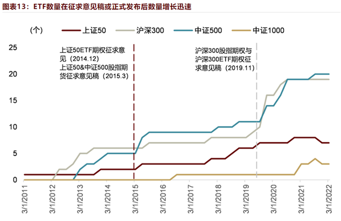 中金研究所统计了上证50、沪深300、中证500衍生品征求意见稿出台后,相关ETF的数量增长情况。