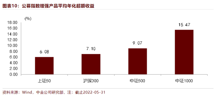 中金计算了A股主要指数的增强效果,沪深300、中证500指数增强产品的年化超额收益分别为7.1%、9.07%,而中证1000指数的年化超额收益为15.47%,增强效果的确非常显著。